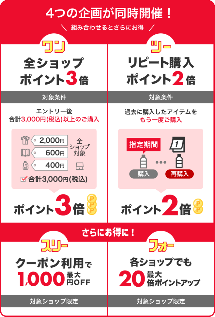 例えば、4ショップで買いまわりをした場合、1~4ショップ目まですべてのお買い物のポイント倍率が4倍(通常ポイント1倍+期間限定ポイント3倍)になります。